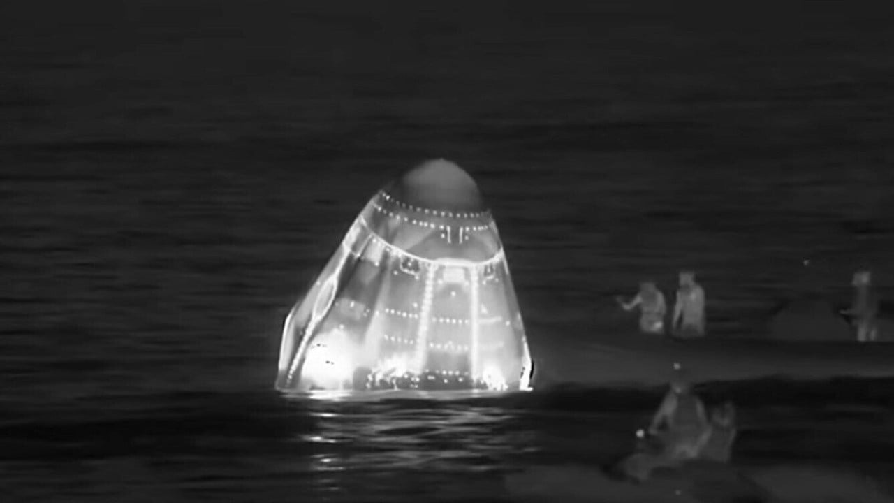 A video feed from Nasa showed the capsule carrying American astronauts Mike Fincke and Zena Cardman, Russian cosmonaut Oleg Platonov and Japanese astronaut Kimiya Yui land off the coast of San Diego at 12.41am local time.